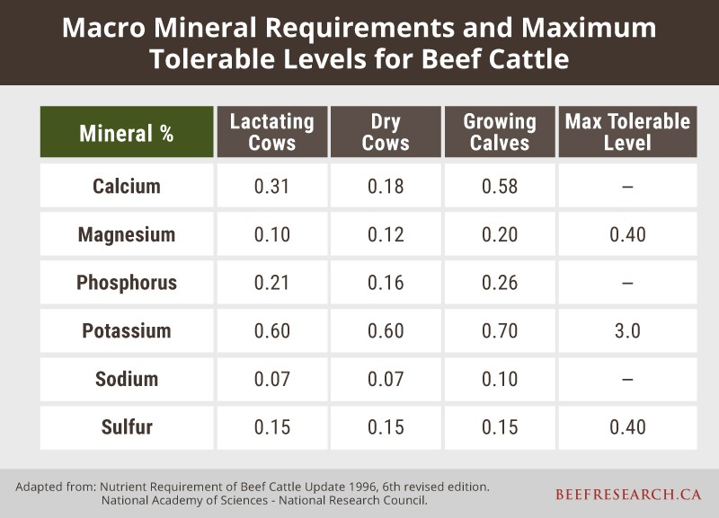 The seven macrominerals required by cattle are calcium (Ca), magnesium (Mg), phosphorus (P), potassium (K), sodium (Na), chlorine (Cl) and sulphur (S). Macrominerals are required in amounts over 100 parts per million (ppm) and are often expressed on a percent (%) dry matter (DM) basis of the animal’s diet.