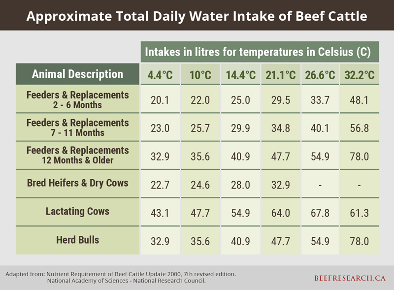 Water is an essential nutrient for cattle, accounting for between 50 and 80 percent of an animal’s live weight. Insufficient water intake reduces animal performance faster and more dramatically than any other nutrient deficiency. For livestock to maximize feed intake and production, they require daily access to palatable water of adequate quality and quantity.