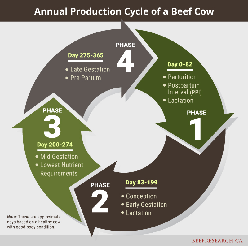 Nutritional requirements of beef cattle are influenced by the stage of production. This production cycle, which is based upon a well-managed, healthy cow in good condition (Body Condition Score = 3) maximizes profitability by producing a calf every 365 days. The annual production cycle, based upon ideal length of time for each phase, includes: